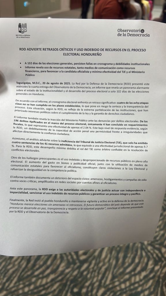 La Red por la Defensa de la Democracia (RDD) presentó este 20 de agosto un informe que pone en duda la integridad del proceso electoral en Honduras, señalando incumplimientos en el cronograma, debilidad institucional y uso político de recursos estatales.