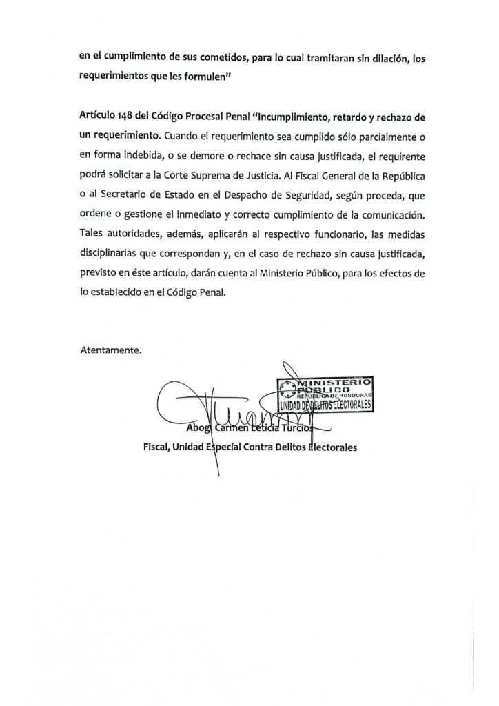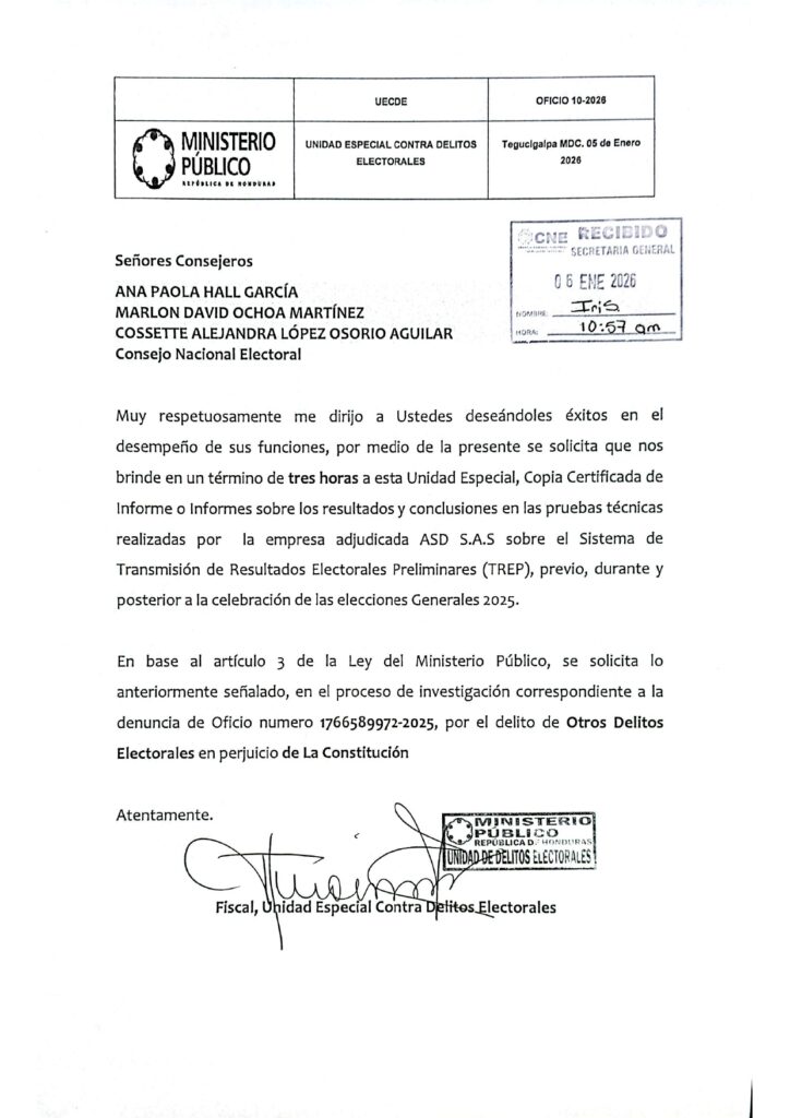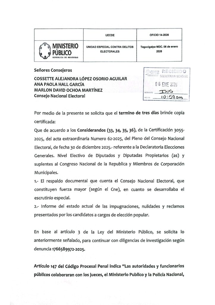 El Ministerio Público (MP) dio este martes un plazo oficial a los consejeros del Consejo Nacional Electoral (CNE) —Ana Paola Hall, Cossette López y Marlon Ochoa— para remitir copias de los informes relacionados con el proceso electoral.