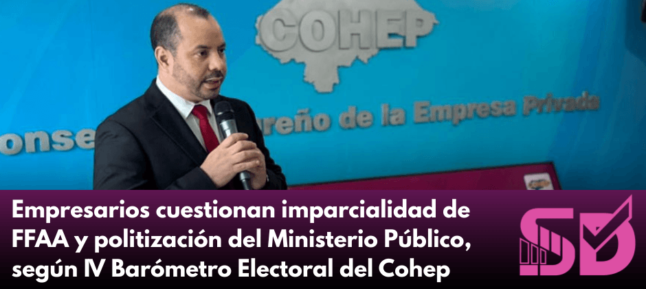 Siete de cada diez empresarios hondureños consideran que la cúpula de las Fuerzas Armadas (FFAA) no actúa con imparcialidad en el proceso electoral, y más de la mitad percibe que el Ministerio Público (MP) está politizado. Así lo revela la cuarta edición del Barómetro Electoral presentado este lunes por el Consejo Hondureño de la Empresa Privada (Cohep).