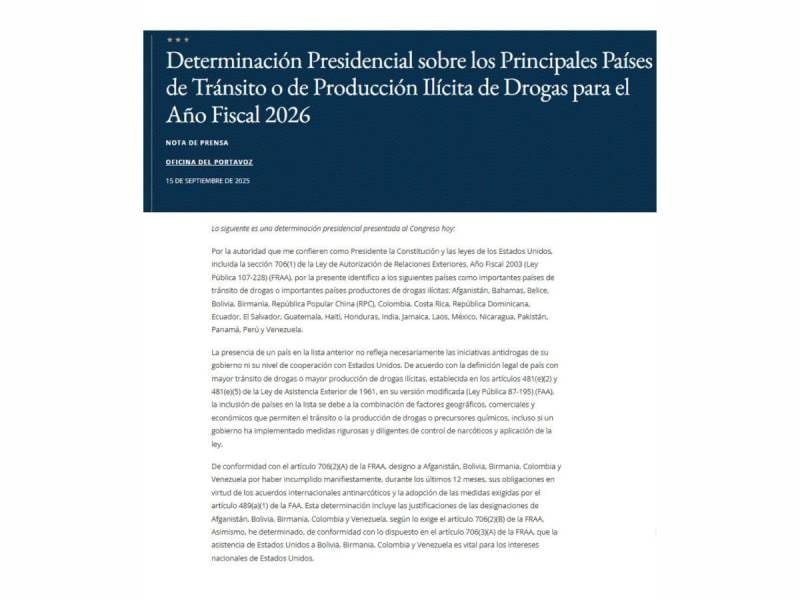 La designación fue emitida por el presidente Donald Trump, en virtud de la autoridad que le confieren la Constitución y las leyes estadounidenses, específicamente la sección 706(1) de la Ley de Autorización de Relaciones Exteriores (FRAA). El comunicado aclara que la inclusión en esta lista no implica necesariamente una falta de cooperación ni descalifica los esfuerzos nacionales en la lucha contra el narcotráfico.