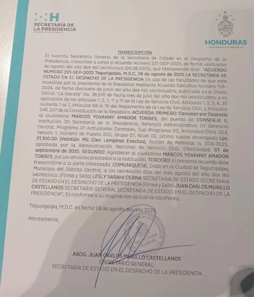 Según una denuncia anónima recibida por Noticias 24/7 HN, el ciudadano Marco Yovanny Amador Torres —quien se desempeñaba como Conserje 2 y contaba con un carnet oficial emitido por la Secretaría de Desarrollo Social (Sedesol) que acredita su condición— fue cesado de su cargo mediante un documento fechado el 28 de agosto. El oficio establece la cancelación por cesantía y consigna un último salario de 21,100 lempiras, sin ofrecer explicación alguna sobre los motivos del despido.