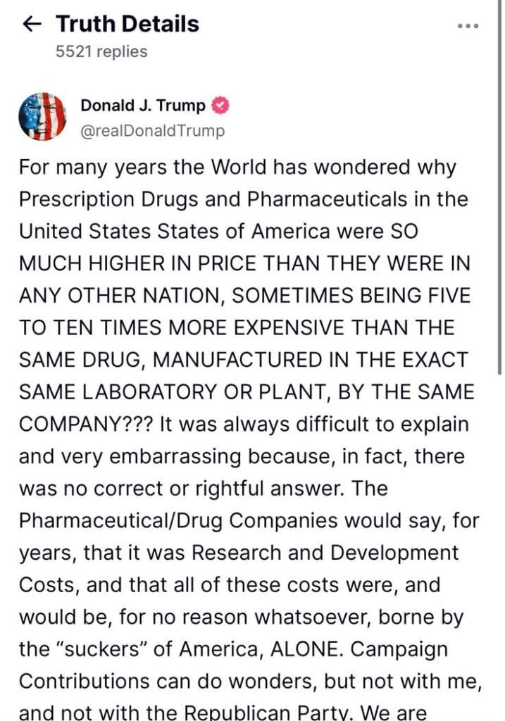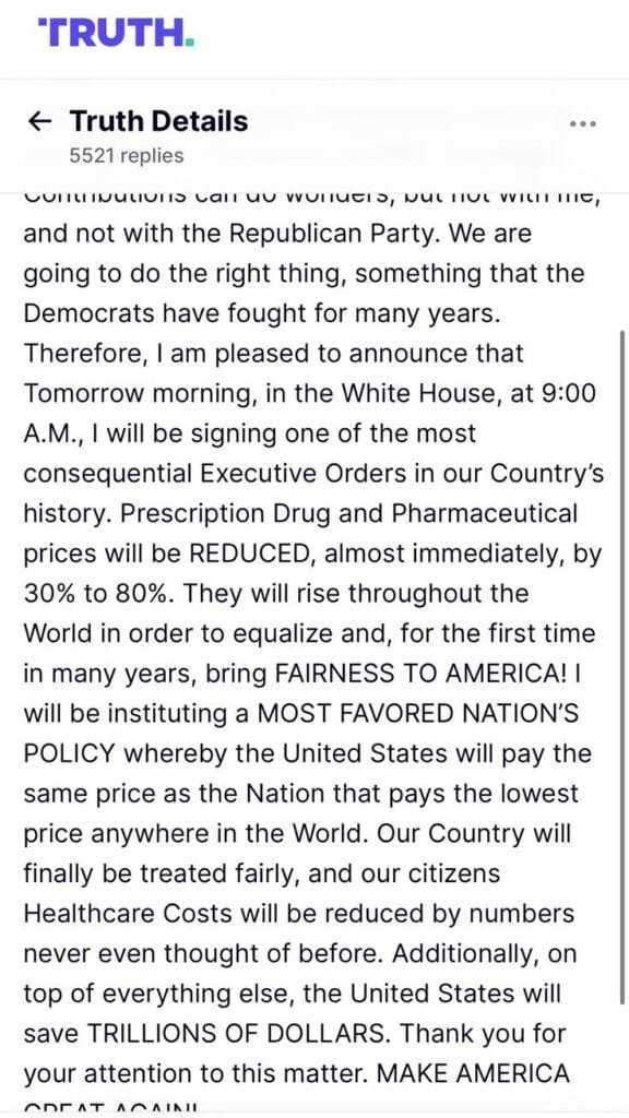 Desde su plataforma Truth Social, el mandatario calificó la decisión como “una de las órdenes ejecutivas más importantes en la historia de nuestro país”. Asimismo, aseguró que el impacto será inmediato, lo que representará un ahorro significativo para los ciudadanos y para el sistema de salud nacional, el cual, según Trump, verá reducciones en costos “nunca antes imaginadas”.