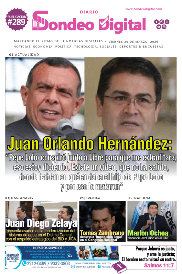 InicioPortada del día Portada del día Portada del día 20/03/2026 By sondeodigitalhn@gmail.com 26/04/2025 0 427 FacebookTwitterPinterestWhatsApp TagsPeriódicos del díaPortada de PeriódicosPortada del día Cuota FacebookTwitterPinterestWhatsApp Artículo anteriorReal Madrid suspende actividades previas a la final tras polémica arbitralArtículo siguienteEste sábado, alrededor de 250,000 personas se congregaron en la Plaza de San Pedro, en el Vaticano, para rendir homenaje y despedir al papa Francisco sondeodigitalhn@gmail.comhttp://sondeodigital.com Related Articles Actualidad Gobierno analiza otorgar contrato de placas a empresa alemana vinculada a gestión de Ebal Díaz Actualidad Meditación de Hoy – La fortaleza de avanzar Actualidad Integración energética del Triángulo Norte impulsa inversión y crecimiento regional DEJA UNA RESPUESTA Cancelar respuesta Comentario: Por favor ingrese su comentario! Nombre:* Por favor ingrese su nombre aquí Correo electrónico:* ¡Has introducido una dirección de correo electrónico incorrecta! Por favor ingrese su dirección de correo electrónico aquí Sitio web: Guardar mi nombre, correo electrónico y sitio web en este navegador la próxima vez que comente. Síguenos0FansMe gusta0SeguidoresSeguir0SeguidoresSeguir - Advertisement - Lo más reciente Actualidad Gobierno analiza otorgar contrato de placas a empresa alemana vinculada a gestión de Ebal Díaz Actualidad Meditación de Hoy – La fortaleza de avanzar Actualidad Integración energética del Triángulo Norte impulsa inversión y crecimiento regional Actualidad Cohep llama a impulsar campañas de ahorro ante el fuerte aumento en los combustibles Actualidad Exdirectora del 911 asegura que entregará expedientes de más de 1,500 empleados y niega irregularidades Cargar más